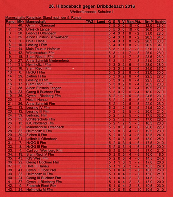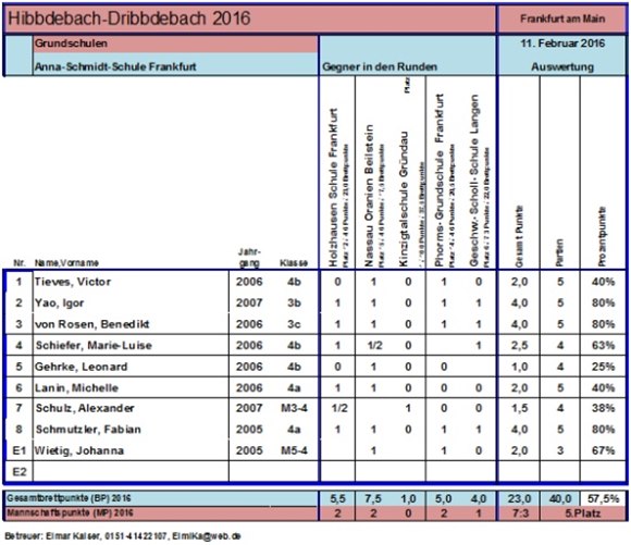 "Hibbdebach-Dribbdebach" - Das Albert-Einstein-Gymnasium aus Schwalbach musste mit 8:2 Punkten und 28,5 Brettpunkten das Gymnasium Oberursel, die Albert-Einstein-Schule Dreieich Langen und das Leibnitz-Gymnasium aus Offenbach in der 5.Runde noch vorbei lassen, weil die 3,5:4,5 Niederlage neben den zwei Mannschaften mit je 10:0 Mannschaftspunkten auch noch den Schlussrundengegner mit 8:2 Punkten und besserer Brettpunktzahl 31,5 den letzten Pokalplatz eroberte. Die Anna-Schmidt-Schule aus Niedererlenbach belegte mit 7:3 Mannschaftspunkten und 21 Brettpnkten den 10.Platz. Die Stadtschule Anna-Schmidt hatte zwar einen Brettpunkt mehr, aber nur 5:5 Team-Punkte und kam so in der Schlusstabelle nur auf den 21.Platz von 43 Teams.