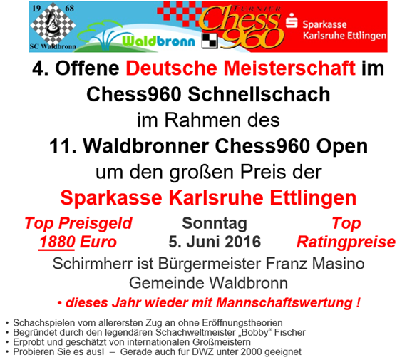 30.05.2016 - Gründe, Chess960 zu spielen, gibt es viele, Gründe, mal einen Tagesausflug in das wunderschöne Waldbronn nahe Karlsruhe zu machen, sind ebenfalls mannigfaltig - warum also das Ganze nicht miteinander verbinden? Am 05. Juni 2016 kommt nach einjähriger Pause das Waldbronner Chess960 Open zurück. Völlig zu Recht unbescheiden wirbt das Turnier ferner mit dem Titel "4. Offene Deutsche Meisterschaft im Chess960 Schnellschach" und hat dafür zudem einen sehr beachtlichen Preisfonds anzubieten. 1.880,- Euro, davon satte 500,- für den Sieger, das kann sich für ein Tagesturnier mehr als sehen lassen. Titelhalter ist DER Sammler deutscher Meisterschaften schlechthin, Chess Tiger GM Klaus Bischoff. Wie gewohnt gibt es aber auch zahlreiche Rating- und Sonderpreise inklusive Teamwertung. Ach ja, amtierender deutscher Mannschaftsmeister sind übrigens ebenfalls die Chess Tigers, und sagen wir mal so, der Wille, unseren Titel zu verteidigen, könnte durchaus sehr stark vorhanden sein... ;-)