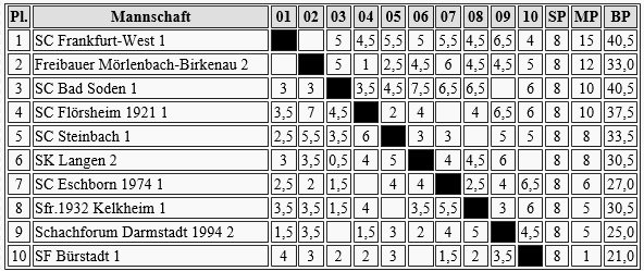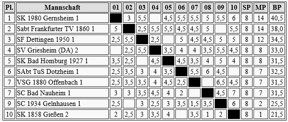 Gernsheim oder Frankfurt, einer dieser beiden wird praktisch Hessenmeister, experimental-theoretisch auch Dettingen, aber drei Wunder in einer Schlussrunde?! Frankfurt muss 2,5 Brettpunkte aufholen, das heißt, Gernsheim darf eigentlich nur knapp gewinnen, ausgerechnet gegen den Bezirksnachbarn aus Griesheim. Frankfurt hat gegen die Wertungsriesen aus Gelnhausen anzutreten, die bereits abgeschlagen auf einem möglichen Abstiegsplatz liegen.