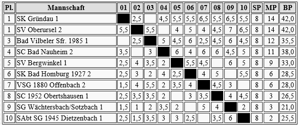 OST - Tja, Gründau und Oberursel liegen absolut punktgleich vorne in der Oststaffel, Gründau hat mit Bad Vilbel den etwas stärkeren Gegner in der Schlussrunde, Oberursel "nur" Bad Nauheim. Interessant, dass hier der MVS dem Bezirk Frankfurt in puncto Abstieg keine Chance lässt. :-)