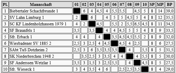NORD - Noch enger ist die Situation in der Nordgruppe der Verbandsliga, wo der zukünftige Meister und Vizemeister nur einen halben Brettpunkt voneinander getrennt sind. Niederbrechen versäumte es in der der letzten Runde gegen Schlusslicht Vellmar groß abzuräumen, während Schöneck eben einen halben Punkt mehr herausspielte. Jetzt noch ein 8-0 gegen Idstein, und der Aufstieg ist perfekt. Wenn's denn immer so einfach wäre.