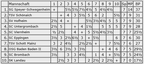 Die Schach-Chroniken bekennen sich dieses schweren Vergehens aber schuldig und bieten den interessierten Lesern schon seit Samstagabend, also noch am Turniertag, einen Blick in Einzel- und Mannschaftergebnisse, und natürlich auch eine Kreuztabelle. Ohne verstümmelte Vereinsnamen.