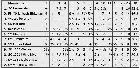 Qualifizieren für die Deutsche kann sich nur eine Mannschaft, aber Platz 2 bis vier sind immerhin vorqualifiziert für das kommende Jahr. Hier fand durch die Neuordnung ein Verdrängungswettbewerb statt. Hofheim wurde Zweiter, wie im Vorjahr. Mörlenbach wurde Dritter, auch wie im Vorjahr, nur Schöneck stürzte ab: bis auf Rang 4. Die Reise nach Rom verloren hat Oberursel, die lediglich Fünfter wurden, wenn auch die Brettpunkte eine andere Sprache sprechen. Aber das ist wie mit dem Ballbesitz im Fußball.
