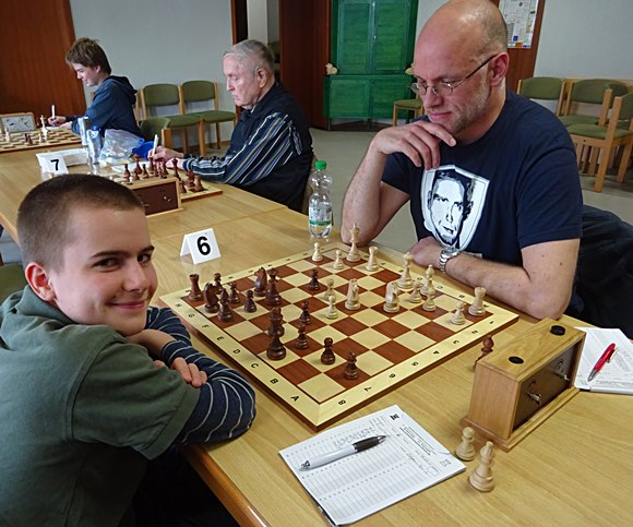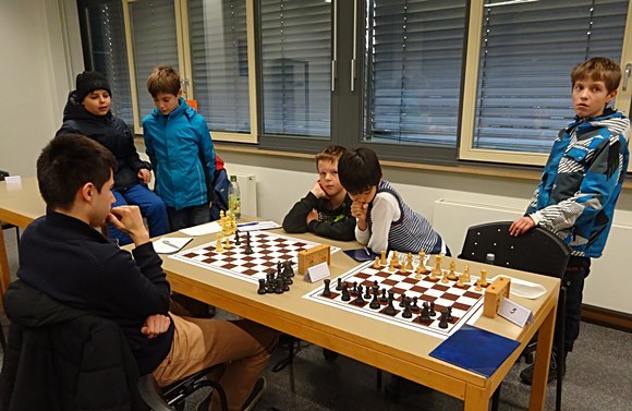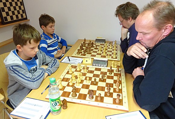 Brett 1: Hans-Walter Schmitt (DWZ 1917) vs Gregor Reichel (DWZ 1398) 1:0 Der Coach und Spielertrainer musste in der Partie schon 100% sicher gewinnen, um wenigstens den Anschlusstreffer zum 3:4 zu erzielen und dann konnte Miksa Ratfai versuchen in einem totremisen Bauernendspiel den erwachsenen Spieler noch auszutricksen - was ihm dann auch zum Entsetzen der eigenen Mannschaftskollegen gelang - also 4:4 am Schluss! Zum ersten Mal gelang damit ein Punktgewinn gegen eine komplette Erwachsenenmannschaft. Klasse gemacht von den Jungen.