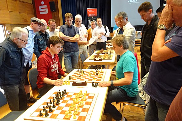 Die erste Runde läuft und Samuel Weber startet sehr gut, GM Artur Jussupow ist noch kalt und hatte Startschwierigkeiten, Hans-Walter Schmitt als 40igster der Meldeliste spielt am allerletzten Brett 40 ohne jegliche Probleme gegen die Nummer 80 der Setzliste Hoatian Zhang. Samuel Weber aus Flörsheim schlägt hier gerade Armin Jäschke (IPS 2181) vom SC Ostfildern