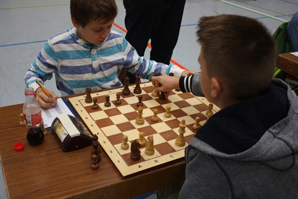 Den schnellsten Sieg landete bei den U14ern Pawel Pfaff (Vordergrund) mit einem verzögerten und von seinem Trainer noch so gerade gebilligten Schäfermatt