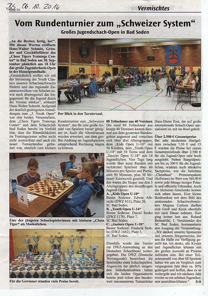 CTTC Turniere / Schach Erleben Jugend-Vereinsmeisterschaft 2016 des SC Bad Soden Integriert in die Youth Classic - Kids Open U10 - Youth Open U14 - Juniors Open U18 - wurde die Jugendmeisterschaft ausgetragen. Gesamtsieger mit 6 Punkten aus 9 Runden wurde Daniel Senko!