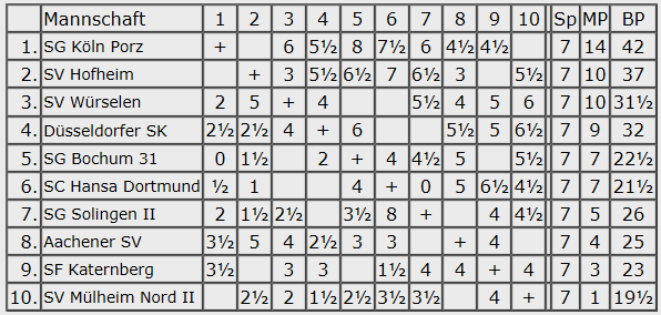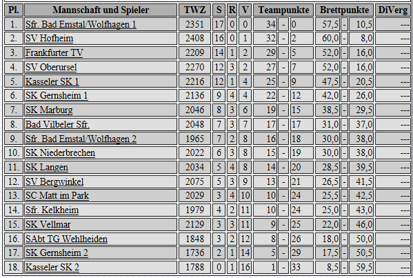 Kurioserweise siegte Bad Emstal/Wolfhagen wie im Vorjahr ohne einen einzigen Teampunkt abzugeben, aber in keinem Fall, Ersatzspieler ausgenommen, konnte eine Brettwertung gewonnen werden. Dies war der ökonomischen Mannschaftsspielweise geschuldet, denn man brachte einen Wechselspieler mit, der dafür sorgte, dass man im entscheidenden Moment hellwach und ausgeruht war.