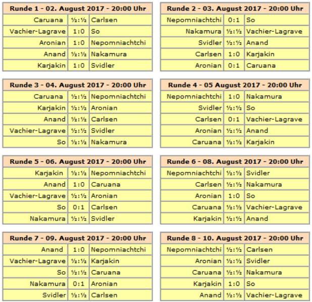 Sollte es am Ende zu einem Gleichstand um Platz 1 kommen, wird am 12. August ein Schnellschach- und ggf. Blitz-Tiebreak gespielt.