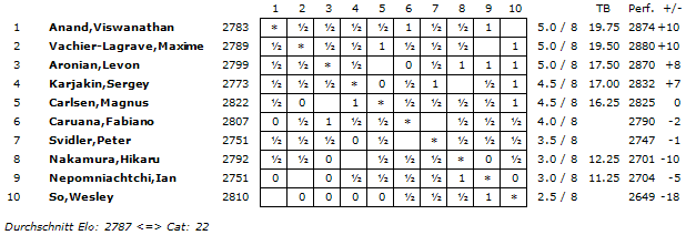 Mit einem ELO-Schnitt von 2787 wird die Turnierkategorie 22 erreicht.