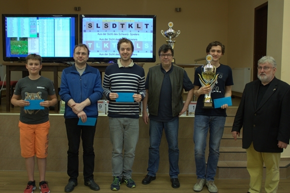 v.l.n.r. IM Vincent Keymer (5.), IM Mikhail Zaitsev (4.), FM Johannes Carow (3.), GM Klaus Bischoff (2.), GM Alexander Donchenko (Sieger) & Hans-Walter Schmitt