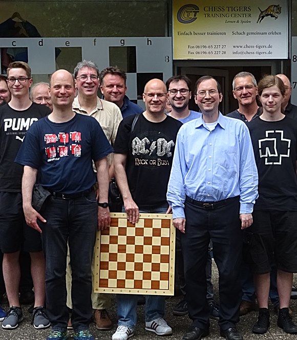 31.05.2018 - Im fast vollbesetzten Chess Tigers Training Center konnten 23 Teilnehmer die fundierten Kenntnisse unseres "Standard"-Seminarleiters Dr. Karsten Müller beiwohnen. Wer Freitagabend schon die Gelegenheit hatte beim "Championsdinner" im Restaurant La Cucina - 80m vom Traning Center entfernt - teilzunehmen, konnte den temporär in Bad Soden lebenden und trainierenden aktuellen Schnell-Schach Weltmeister mit seinem ehemaligen Sekundanten Radoslav Wojtaszek "life" erleben, ehe er zum Super-Turnier nach Stavanger (Norwegen) samstags abreiste, nachdem die Beiden gerade vom Bundesliga-Stichkampf OSG Baden-Baden gegen SG Solingen 4,5:3,5 erfolgreich am Donnerstag in der Nacht nach Bad Soden am schönen Taunus angekommen waren. Zum 17.Mal war der Hamburger Endspiel-"Papst" Karsten Müller in Bad Soden und war hocherfreut sich mit den beiden Top-Großmeistern im Beisein einiger enthusiastischer Schachjünger über die jüngsten Entwicklungen im Weltschach zu informieren. Besondere Erwähnung sollte auch unser Dauerteilnehmer Dariusz Gorzinski errhalten, der dieses Mal für alle anderen Teilnehmer eine selbstdesignten Kaffeebecher mit den Konterfeis von Viswanathan Anand & Vladimir "Borisovich" Kramnik kreierte und produzieren ließ. Wow!! Dankeschön und die Bonbondosen der Chess Tigers ergänzen dieses besondere Erlebnis zum Thema "Spielen wie die Weltmeister".