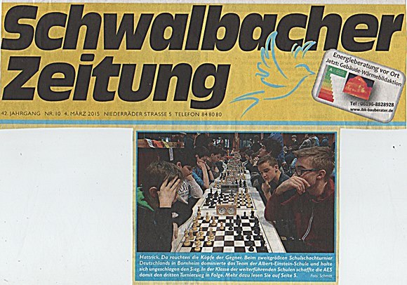 Die Schwalbacher Zeitung berichtet mit einem Bild auf dem Titel, loben Ihre Schulen AES und GSS und das Team aus dem Chess Tigers Training Center in Bad Soden und "die" sind auch ganz zufrieden!