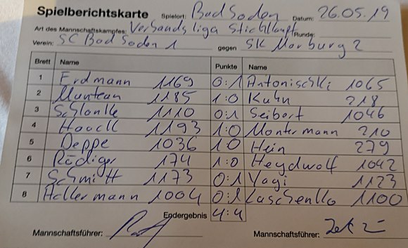 Reihenfolge Protokoll mit aktuellem Spielstand: Brett 7, Hans-Walter Schmitt 0 / 0:1, Brett 5, Leo Max Deppe 1 / 1:1 Brett 3, Ulf Schlanke 0 / 1:2 Brett 8, Robert Ackermann 0 / 1:3 Brett 8, Stefan Erdmann 0 / 1:4 Brett 4, Kevin Haack 1 / 2:4 Thomas Rödinger 1 / 3:4 Brett 4, Dr. Radu-Liviu Munteanu 1 / 4:4 Berliner-Wertung: 7 + 5 + 4 + 3 = 19 gegen 8 + 6 + 2 + 1 = 17, also 19:17 für den SC Bad Soden 1. ultra-knapp, aber super-süss!!