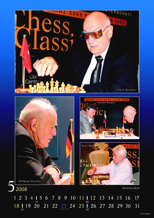 Das Titelbild sagt einiges über die momentane Situation in der Schachwelt mit der selbstbewussten Haltung des Ehrenmitglieds der Chess Tigers aus. Die L-förmigen Anordnung der einzelnen Kalenderbilder auf dem Titelblatt soll den Inhalt offen auf einen Blick zeigen. Viele Kalender haben die Eigenheit, dass Sie ein bis zwei gute Bilder haben und der Rest ist Standard. Der Chess Classic Kalender DIN A2 - 420 x 594mm - zeigt kompromislos in Bildern seine Themen. Es sollte eine edle Ausgabe werden, ohne Schnick-Schnack auf 170g/m2-Papier und 725g schwer. Keine überflüssigen Informationen, keine abtörnenden Schachaufgaben, keine schachtypischen Sprüche, nur die Komposition der Bilder soll den nackten Genuss bringen und die Faszination der Schach-Genies bei der Chess Classic der letzten 14 Jahre in Frankfurt (7) und Mainz (7) vermitteln. Ein Stilleben, ein Stummfilm ohne jegliche Ablenkung. Die kleinen blauen Ziffern sollen nur die Information zur Person der genialen Zeitgenossen zeigen, die jemals bei uns in der Rhein-Main-Taunus Region gespielt haben - die Auswahl unter 2000 guten Bilder fiel extrem schwer, aber unserer Graphiker Fränk Stiefel hat ein Händchen, um die Philosophie der Chess Tigers voll umzusetzen.