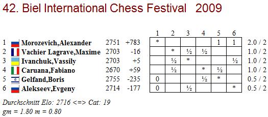 Biel - Nach zwei Runden beim 42. Biel International Chess Festival sorgt nur Alexander Morozevich für Gesprächsstoff im Großmeisterturnier. Der Russe reiste offensichtlich siegeshungrig in die Schweiz und stillte sein Verlangen gleich mal mit einem Doppelschlag. In der ersten Runde schlug er Titelverteidiger Evgeny Alekseev und legte dann gestern gleich noch gegen den topgesetzten Boris Gelfand einen vollen Punkt nach. Alle weiteren Begegnungen endeten bisher dagegen im Remishafen, sodass Moro bereits mit einem ganzen Zähler führt und nach 2003, 2004 und 2006 die besten Voraussetzungen für seinen vierten Triumph in Biel geschaffen hat.