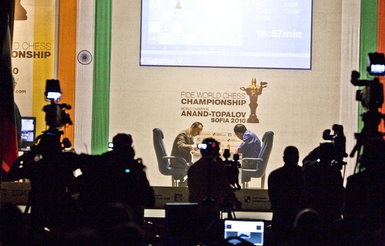 Enttäuscht sind viele fachkundige Beobachter von der Zuschauerresonanz vor Ort in Sofia: Nach zwei sensationellen und entschiedenen Auftaktpartien kamen gestern nur 30-35 zahlende Zuschauer in den Military Club, davon zwei aus Deutschland, Jessica & Thomas Meisegeier. Man hätte erwarten können, dass nach so einem spektakulären Auftaktschlacht die wenigen Sitze (240) nicht ausreichen, wenn der bulgarische Volksheld Veselin Topalov, an vielen Einfallstraßen groß plakatiert, nach der höchsten Krone im Schach greift. Der G8-Gipfel der Figuren auf dem ungewöhnlichen Feld g8 fand aufgrund außergewöhnlicher Manöver Einzug in den Titel dieses Artikels. Zuerst steht der Springer auf g8, dann folgt das einfache Decken des Bauers g7 mit Tg8 und später wird der Läufer von h7 über g8 ins Spiel gebracht. Derlei wird in der Turnierpraxis gar nicht so oft gesehen.
