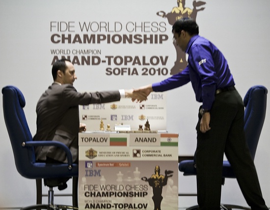 3. Partie: WM-Handschlag vor der Partie in der Topalov die weißen Steine führte ...