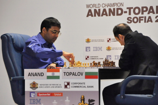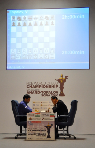 28.04.2010 - Nach 32 Zügen musste Herausforderer Veselin Topalov in der vierten Partie der Schachweltmeisterschaft 2010 gegen den amtierenden Champion das Handtuch werfen. Zunächst hatte Viswanathan Anand bereits im 10. Zug der Katalanischen Eröffnung seinen Gegenüber, mit einer Neuerung konfrontiert und danach Zug um Zug den Druck auf diesen erhöht. In komplizierter Lage beschloss der Bulgare, sich mit h7-h6 ein Luftloch zu machen, doch offenbar hatte er nicht damit gerechnet, dass sich bereits drei Züge später ein weißer Springer auf h6 opfern würde. Mit 23.Sg4xh6+!! legte Anand den schwarzen König frei und zahlte es somit seinem Kontrahenten mit gleicher Münze heim. In der ersten WM-Partie war es noch Topalov gewesen, der mit einem Springeropfer die Führung übernommen hatte. Morgen haben die Spieler ihren nächsten Ruhetag, und während sich das Team Topalov für die nächste Weißpartie rüsten wird, muss man sich offenkundig auch Gedanken machen, wie man die hundertprozentige Weißquote des Weltmeisters brechen will.