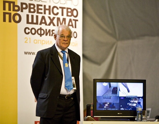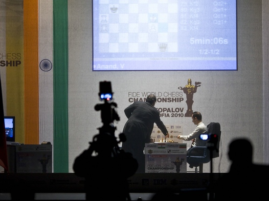 der Hauptschiedsrichter Nikolopolous stellt die Uhr ab, um die dreifache Stellungswiederholung zu prüfen, mittlerweile hat Anand dies seinerseits bestätigt.