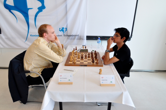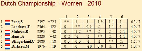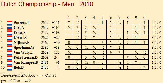 Eindhoven (NED) - Im Männer-Turnier der Dutch Championships 2010 haben Anish Giri und Jan Smeets ihre gemeinsame Führung sicher verteidigt. So wirklich in Gefahr war sie aber auch nicht, denn beide spielten gegeneinander und nach nur 15 Zügen war die Stellung remis - zumindest sahen die Spieler es so. Die einzige entschiedene Partie gab es zwischen Benjamin Bok und Sipke Ernst. Letzterem gelang ein klarer Sieg und nun ist Ernst auf einen halben Zähler an das Führungsduo herangekommen. Derweil gönnte Zhaoqin Peng sich nach sechs Siegen in Serie eine Verschnaufpause. Angesichts des sicheren Turniersiegs gestattete die gebürtige Chinesin ihrer Gegnerin Anne Haast ein Kurzremis.