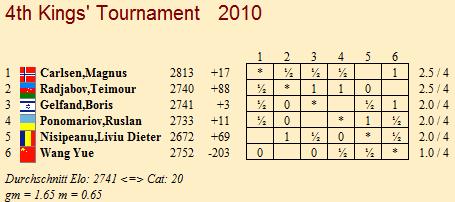 Mediaş (ROM) - Im Dezember letzten Jahres bei der Erstauflage der London Chess Classic wählte Magnus Carlsen gegen Vladimir Kramnik "natürlich" die Englische Eröffnung und gewann. Heute setzte er diesem lustigen Spiel im wahrsten Sinne die Krone auf, denn was ist logischer, als beim Kings' Tournament das Königsgambit zu spielen? Okay, das letzte Mal, dass dieses Gambit auf höchstem Niveau gespielt wurde, liegt rund zehn Jahre zurück, und selbst Alexander Morozevich hat es danach nicht mehr gegen Weltklassespieler angewandt, was natürlich auch gute Gründe hat. Es war auch keineswegs die Eröffnung, die Wang Yue heute verlieren ließ, vielmehr hatte er sogar ausgezeichnete Chancen auf ein Remis, aber dann verlor der Chinese die Geduld und glaubte, sich in ein Remisendspiel mit Minusqualität retten zu können. Ein klares Fehlurteil, wie ihm sein norwegischer Gegner nachdrücklich bewies. Da parallel Teimour Radjabov seinen zweiten Sieg in Serie hinlegte - dieses Mal gegen Boris Gelfand -, führt er nun gemeinsam mit Carlsen die Tabelle an. Und selbst die dritte Begegnung zwischen Ruslan Ponomariov und Liviu-Dieter Nisipeanu endete nicht unentschieden. Mit dem dritten Weißsieg des Tages gab Ponomariov die rote Laterne an Wang Yue ab.