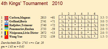 Mediaş (ROM) - In der vierten Runde des 4. Kings' Tournament hatte Magnus Carlsen seinen ersten Sieg erzielt, und in der heutigen fünften legte er gleich noch einen nach. Liviu-Dieter Nisipeanu stellte den Drachen des Norwegers auf die Probe und wurde nicht enttäuscht. Fachmännisch wurde der Rumäne zerlegt, wobei er zum Schluss noch einen dicken Bock schoss und sich gleich nach 31.Lb6?? aufgab, ohne die Antwort seines Gegners abzuwarten. Ebenfalls siegen konnte Boris Gelfand, der damit nur einen halben Punkt hinter dem Führenden zurück bleibt. Der Israeli mit russischen Wurzeln konnte Ruslan Ponomariov schlagen und darf sich daher zusammen mit Teimour Radjabov Chancen auf den Turniersieg ausrechnen. Radjabov verlor im Endspiel gegen Wang Yue zwar einen Bauern, erhielt dafür aber ausreichend Kompensation, weshalb der Chinese nach 41 Zügen dem Remis zustimmte. Das Turnier ist zwar erst bei seiner Halbzeit angelangt, doch es ist schwer vorstellbar, dass ein anderer Spieler außer Carlsen, Gelfand oder Radjabov den Turniersieg einstreichen wird.
