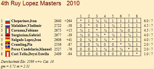Villafranca (ESP) - Vom 11. bis 19. Juni fand in Villafranca de los Barros das Ruy Lopez Chess Festival 2010 statt. Gekrönt wurde die Veranstaltung von einem siebenrundigen GM-Turnier der Kategorie 14 (ELO 2599). Favorit auf den Sieg war der einzige 2700er, Vladimir Malakhov, doch dieser musste sich letztlich zusammen mit Fabiano Caruana den zweiten Rang teilen. Souveräner Sieger wurde Ivan Cheparinov mit deutlichen 1,5 Punkten Vorsprung und einer Performance über 2900. Der Bulgare, der seit Jahren Veselin Topalovs Sekundant/Schüler ist, holte 6 aus 7 und verlor als einziger Teilnehmer keine Partie. Für Cheparinov war das der zweite Titel in Folge beim Ruy Lopez Master. Für Aufmerksamkeit sorgte der junge Mann 2008, als er seinem Meister Topalov und dessen (und damit auch seinem) Manager Silvio Danailov imponieren wollte, indem er beim Corus Chess Tournament 2008 seinem Gegner Nigel Short den Handschlag verweigerte. Short hatte sich in der Vergangenheit mehrfach kritisch über Topalov und Danailov geäußert. Wegen Unsportlichkeit sollte Cheparinov daraufhin die Partie kampflos verlieren, doch nicht zum ersten intervenierte Danailov erfolgreich. Cheparinov entschuldigte sich und so wurde die Partie tatsächlich nachgespielt. Nicht nur sehr zur Freude des Briten, gewann Short souverän.