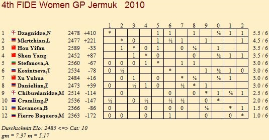 Jermuk (ARM) - Im November 2009 hatte Nana Dzagnidze ihre bisher höchste Elo mit 2547 und war kurzzeitig sogar die Nr. 3 der Frauenweltrangliste, doch das Schachjahr 2010 lief bisher nicht gut und so fiel fiel auf Elo 2478 und Rang 25 zurück. Doch just beim FIDE Women Grand Prix in Jermuk dreht die 23-jährige so richtig auf und beweist bisher, dass sie zu den besten Spielerinnen der Welt gehört. Immerhin schlug sie in der heutigen Runde mit Tatiana Kosintseva einen Hochkaräter im Frauenschach und liegt mit ihren 5,5/6 bei einer Performance von 2888! Dzagnidze war aber auch heute nicht die einzige Frau, die voll punkten konnte. Ganz im Gegenteil, wie schon in der zweiten Runde fanden alle sechs Partien eine Siegerin und zum ersten Mal gewann ausschließlich die Weißpartei. Bei einer Remisquote von 19% haben sich alle Teilnehmerinnen den morgigen Ruhetag redlich verdient. Runde 7 folgt dann am Donnerstag.
