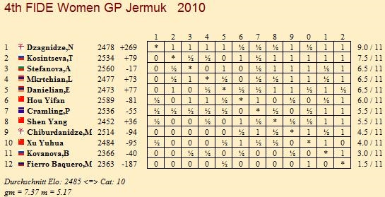 Jermuk (ARM) - Bereits frühzeitig stand beim FIDE Women Grand Prix in Jermuk fest, dass nur Nana Dzagnidze das Turnier für sich würde entscheiden können, zu dominant war die Georgierin. Letztlich wurden es nach 11 Runden stolze 7,5 Punkte und eine Performance von 2747, während die beste Konkurrentin Tatiana Kosintseva auf Rang 2 1,5 Punkte weniger erzielte. Damit hat Dzagnidze sich nicht nur den 6.500,- Euro-Siegerscheck redlich verdient, sie übernahm in der Grand Prix-Wertung auch die Spitzenposition, welche "später mal" für ein WM-Duell gut sein soll. Zwei GP-Turnier stehen noch aus, stattfinden werden sie vom 29. Juli bis 12. August in Ulanbaatar (Mongolei) und vom 27. Oktober bis 09. November in Santiago (Chile).