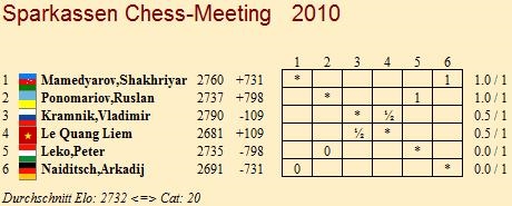 Gebracht hat das dem in früheren Jahren recht remislastigen Turnier laut der ersten Runde tatsächlich etwas. Von den drei Partien endete nur eine friedlich und das erst nach 64 Zügen. So lange versuchte der neunfache Chess-Meeting-Sieger und amtierende Titelverteidiger Vladimir Kramnik gegen den Debütanten aus Vietnam Le Quang Liem ein völlig ausgeglichenes Schwerfigurenendspiel zu gewinnen. Mehr Erfolg hatten dagegen Shakhriyar Mamedyarov und Ruslan Ponomariov. In einer spannenden Partie mit hochgeklappten Visieren konnte Ersterer gegen Arkadij Naiditsch gewinnen. Der Deutsche übersah die taktische Wendung im 21. Zug und verlor nach unterhaltsamen Eröffnungsverlauf ersatzlos einen Bauern. Der Übergang ins Turmendspiel rette ihn auch nicht mehr, Shak spielte präzise und fuhr verdient den vollen Punkt ein. Auch Ponomariov hat allen Grund, mit seinem Auftakt zufrieden zu sein. Er wählte gegen Peter Leko mit den weißen Steinen die Schottische Partie und nutzte die Tatsache, dass sein König in der Brettmitte geblieben war, um diesen im Endspiel entscheidend in Szene zu setzen. Bald gewann der Ukrainer einen Bauern und kurz darauf auch die Partie.