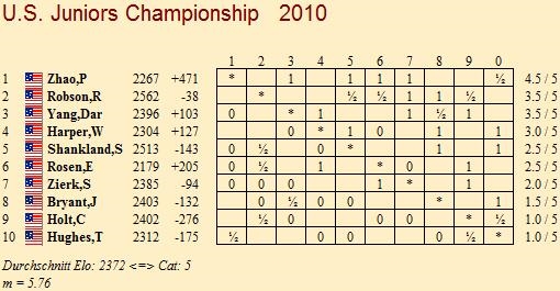 Noch nicht völlig rund läuft es für den klaren Favoriten bei den Junioren. Ray Robson erfüllte im Alter von 14 Jahren, 11 Monaten und 16 Tagen als jüngster Schachspieler der Geschichte im vergangenen Jahr seine dritte GM-Norm und ist der amtierende Titelverteidiger in den Vereinigten Staaten. Doch aktuell stiehlt ihm der titellose Parker Zhao die Show. Mit einer Elo von 2267 holte er bisher 4,5 Punkte und liegt bei einer Performance von 2738.