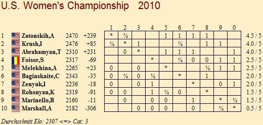 Fünf Runden sind bisher gespielt und bei den Frauen hat sich Titelverteidigerin Anna Zatonskih mit 4.5 Punkten an die Spitze gesetzt. Die größte Konkurrentin im Titelkampf dürfte Irina Krush werden, die im Augenblick einen halben Zähler zurückliegt. Doch Krush muss auf einen Ausrutscher der Rivalin hoffen, denn gegeneinander haben beide bereits in der dritten Runde gespielt, und das Duell endete remis.