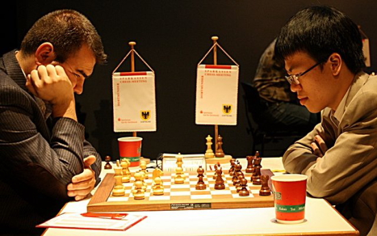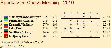 Dortmund (GER) - Ruslan Ponomariov und Shakhriyar Mamedyarov führen nach drei Runden das Sparkassen Chess-Meetings mit 2,5 Punkten an. Während Ponomariov seine gesamte Verteidigungskunst benötigte, um sich .. Züge lang und letztlich erfolgreich den Gewinnbemühungen von Arkadij Naiditsch zu widersetzen, konnte Mamedyarov einen überzeugenden Sieg gegen Liem Quang Le landen. Grund zur Diskussion bot das Remis zwischen Vladimir Kramnik und Peter Leko. 37 Züge lang passierte eigentlich nicht viel, was das Unentschieden in Frage gestellt hätte, doch im 38. Zug unterlief Kramnik ein böser Schnitzer, den Leko auch umgehend nutzte und sich eine Mehrfigur gegen zwei Bauern erspielte. Möglich, dass die Stellung aus Sicht Kramniks irgendwie haltbar war, doch zumindest die gängigen Schachprogramme bezweifeln dies. Leko sah dies offenbar anders, denn er erlaubte Kramnik kurz nach dessen Schnitzer ein simples Dauerschach.