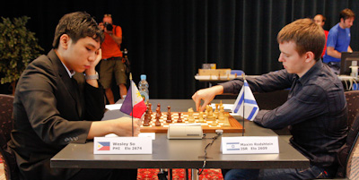 Biel (SUI) - Während die Konkurrenz an der Spitze des Youngstars-Großmeisterturniers heute etwas schwächelte, gab Wesley So gegen Maxim Rodhstein Vollgas und steckte auch nicht auf, als die Stellung mächtig nach einem Remis roch. Und der Filipino wurde für seinen Siegeswillen belohnt, denn sein israelischer Gegner übersah bei knapper Bedenkzeit eine tückische Falle und landete in einem raffinierten Mattnetz. Den zweiten Sieg der dritten Runde konnte Fabiano Caruana gegen einen spätestens jetzt angeschlagenen Parimarjan Negi erzielen und somit den zweiten Rang hinter So übernehmen. Allerdings teilt er sich diesen mit Evgeny Tomashevsky, welcher heute gegen Dimtry Andreikin ein 22-zügiges Schwarzremis einstreute. Hinter einem breiten Mittelfeld liegt Negi dagegen mit noch immer 0 Punkten auf dem letzten Platz.