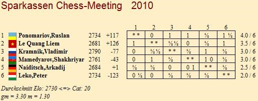 Somit sehen wir auch nach sechs Runden eine unerwartete Spitze beim Chess-Meeting. Erster bleibt Ponomariov und alleiniger Zweiter ist Le vor Kramnik und Mamedyarov. Arkadij Naiditsch konnte die rote Laterne an Leko abgeben.