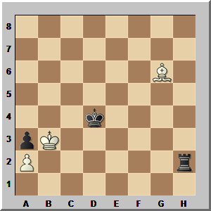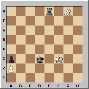 Der Rest der Partie ist nicht minder lehrreich. Die Nalimov Tablebases geben in der Diagrammstellung einen forcierten Gewinn (also bis zum Matt) für Schwarz in 52 Zügen an, sofern sich Weiß optimal verteidigt. Aber wie geht das von statten? Ein Plan ist recht einfach: Schwarz verlockt den Anziehenden, den a-Bauer zu nehmen, um dann mit bekannten Mattmotiven den Läufer zu gewinnen. Weigert sich Weiß, den Bauer zu nehmen, kann Schwarz zu Plan B greifen und den gegnerischen König so weit gen Königsflügel treiben, bis er auf a2 den Turm gegen den Bauern und den Läufer opfern kann. Doch zunächst muss natürlich der eigene a-Bauer gedeckt werden. Also 55...Th6 56.Lf7 Ta6 57.Lg8 Ta7!