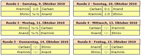 Es gelten die sogenannten Sofia-Regeln. Die Bedenkzeit ist 90 Minuten/40 Züge + 60 Minuten + 10 Sekunden/Zug ab dem 41. Zug. Rundenstart ist täglich um 16:30 Uhr. Am heutigen Dienstag wird der einzige Ruhetag eingelegt. Es gibt 3 Punkte für einen Sieg, 1 für Remis, 0 für eine Niederlage. Sollten nach sechs Runden zwei Spieler die gleiche Punktzahl vorweisen, wird direkt nach der letzten Runde eine Match im Blitzschach über den Sieg entscheiden. Begonnen wird mit zwei Partien (4'+3'') mit wechselnden Farben. Gibt es dann keinen Sieger, folgt eine Armageddon-Partie, in welcher Weiß 5 Minuten erhält und gewinnen muss, während Schwarz nur 4 Minuten erhält und dafür mit einem Remis der Sieger ist.