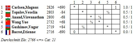 In Nanjing wird ein doppelrundiges Turnier gespielt (also 10 Runden) mit der Bedenkzeit 120 Minuten/40 Züge + 60 Minuten/20 Züge + 15 Minuten + 30 Sekunden/Zug ab dem 61. Zug. Mit einem Elo-Schnitt von 2766 wird die Kategorie 21 erreicht. Man treibt seitens der Organisation wie im vergangenen Jahr die so genannte Sofia-Regel auf die Spitze, indem man Remisangebote nur in theoretischen Remisstellungen – als eigentlich gar nicht – erlaubt. Doch wirklich eingehalten wird diese Regelung in der Praxis offenkundig nicht.