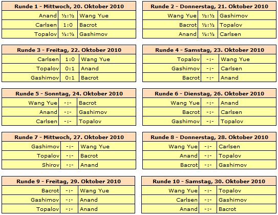 Durch die enorme Zeitverschiebung ist es bei uns noch ziemlich früh am Tag, wenn sich die Spieler ans Brett setzen. Um 8:30 Uhr unserer Zeit werden die Runden beginnen, und die letzte Runde wird gar schon um 4:00 Uhr in der Früh beginnen. Der einzige Ruhetag wird am 25.10. eingelegt.