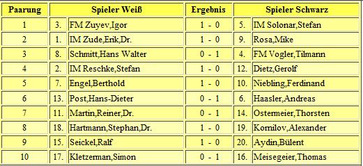 Als es IM Stefan Solonar gelungen war, den letzten Turm von FM Igor Zuyev auf h3 einzukerkern, war er sich sicher, den Titel des ersten Frankfurter Chess960 Stadtmeisters in der Tasche zu haben, aber dabei unterschätzte er den weißen Mehr- und Freibauern auf der b-Linie, sowie die Möglichkeit, dass sich der Turm per Bauernopfer schneller wieder ins Spiel würde einschalten können, als es auf den ersten Blick aussah. Somit ging der Titel völlig verdient an den einzigen ungeschlagenen Spieler im Turnier. An Brett 2 musste IM Erik Zude, zur Verteidigung von Rang 3 unbedingt gegen Mike Rosa gewinnen, der jedoch lange Zeit Paroli bot und erst in der Schlussphase einbrach und vom Meister ausgetanzt wurde. An Brett 3 musste sich der Obertiger Hans-Walter Schmitt seinem Gegner FM Tilmann Vogler beugen, was dennoch nur den undankbaren vierten Rang für den Mainzer bedeutete. Trotz der Niederlage in der Schlussrunde siegte Rosa vor Schmitt in der ersten Ratingklasse und war als bester Spieler ohne Titel doch noch happy. Bester Senior wurde Ferdinand Niebling vom SC Frankfurt-West, der in der Schlussrunde Schützenhilfe von seinem Vereinskollegen Thomas Meisegeier erhielt, der seinerseits nämlich gegen Senior Nummer 2, Simon Kletzerman, gewann und sich so zugleich den Sieg in der dritten Ratingklasse erkämpfte. Die zweite Ratingklasse sicherte sich mit Thorsten Ostermeier der Vorsitzende des hessischen Bezirks 5 (Frankfurt). Die vierte Ratingklasse dominierte klar Dr. Stephan Hartmann von der SG Turm Idstein, der mit 2,5 Punkten in der Schlusstabelle einen ausgezeichneten 12. Rang belegte. Einziger und damit auch bester Jugendspieler war Alexander Kornilov, aber dass es ihm an Konkurrenz mangelte, war nun wirklich nicht seine Schuld. Und last but not least wurde Berthold Engel als bester Spieler seines Verbandes Bezirksmeister. Neben einigen lobenden Erwähnungen wurde von GM Klaus Bischoff die Partie der dritten Runde zwischen Erik Zude und Tilmann Vogler, welche ersterer im Opferangriff gewann, zur Partie des Turniers gewählt. Die Partie können Sie sich gemeinsam mit den anderen über den unten folgenden Link herunterladen. Die Partien der fünften Runde sind noch nicht komplett erfasst und werden in Kürze ergänzt.