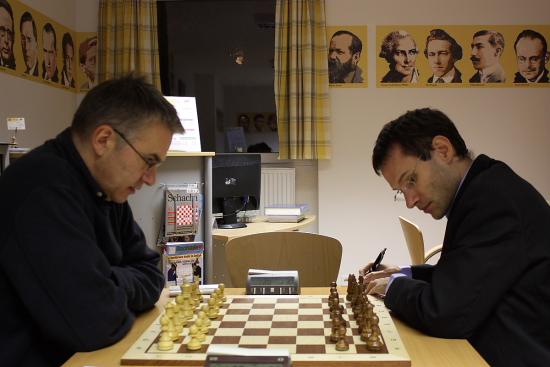 Dr. Stephan Hartmann hatte auch nach der Partie gut Lachen, denn trotz Minusfigur schlug er Alexander Kornilov (rechts)