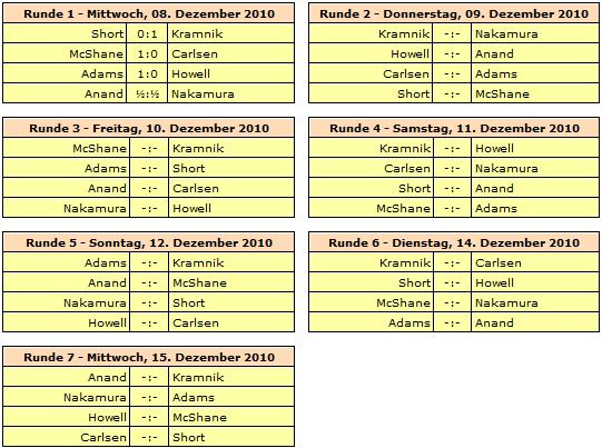 Der Modus in London ist 120 Minuten/40 Züge + 60 Minuten/20 Züge + 15 Minuten + 30 Sekunden/Zug ab dem 61. Zug, und es wird nach den so genannten Sofia-Regeln gespielt. Rundenstart ist täglich 15:00 Uhr unserer Zeit. In London geht es um 14:00 los, aber dort ist man durch die Zeitverschiebung auch eine Stunde hinter uns her. Die zweite Runde beginnt erst um 17:00 Uhr und die letzte Runde bereits zwei Stunden früher als sonst - also bei uns um 13:00 Uhr. Einen Ruhetag wird es geben - und zwar am kommenden Montag (13. Dezember). Für den Fall eines Gleichstandes am Ende ist das erste Kriterium die Anzahl der Schwarzpartien. Danach werden die Schwarzsiege gezählt, dann die Siege mit beiden Farben und dann soll der direkte Vergleich entscheiden. Erst als fünftes Kriterium ist ein Tiebreak bis zum Armageddon vorgesehen.
