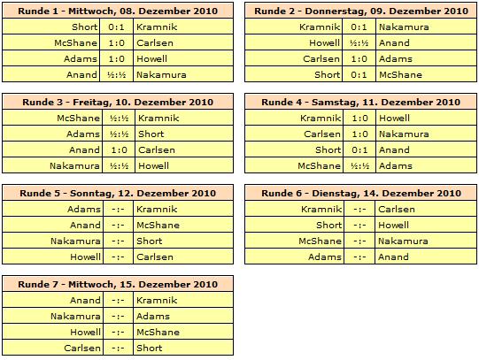 Der Modus in London ist 120 Minuten/40 Züge + 60 Minuten/20 Züge + 15 Minuten + 30 Sekunden/Zug ab dem 61. Zug, und es wird nach den so genannten Sofia-Regeln gespielt. Rundenstart ist täglich 15:00 Uhr unserer Zeit. In London geht es um 14:00 los, aber dort ist man durch die Zeitverschiebung auch eine Stunde hinter uns her. Die letzte Runde beginnt bereits zwei Stunden früher als sonst - also bei uns um 13:00 Uhr. Einen Ruhetag wird es geben - und zwar am kommenden Montag (13. Dezember). Für den Fall eines Gleichstandes am Ende ist das erste Kriterium die Anzahl der Schwarzpartien. Danach werden die Schwarzsiege gezählt, dann die Siege mit beiden Farben und dann soll der direkte Vergleich entscheiden. Erst als fünftes Kriterium ist ein Tiebreak bis zum Armageddon vorgesehen.