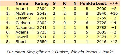Der stärkste aller Tiger wird heute 41 Jahre jung. So viel Zeit muss sein, doch nun zum Geschehen auf den Brettern in London! Tja, und da kann man Anand gleich nochmals gratulieren, denn er machte sich mit seinem Sieg gegen Nigel Short selbst das schönste Geschenk. Damit geht der Inder auch in der Gesamtwertung in Führung, doch diese muss er sich (noch) mit Luke McShane teilen. Der Brite remisierte gegen Landsmann Michael Adams. In der fünften Runde wird es somit zum absoluten Spitzenduell zwischen Anand und McShane kommen, wobei ersterer die weißen Steine führen wird. Dritter ist nun Vladimir Kramnik, denn die russische Nummer 1 siegte souverän gegen David Howell. Und auch Magnus Carlsen konnte mit seinem Sieg gegen Hikaru Nakamura Boden gutmachen und rangiert aktuell auf dem vierten Platz.