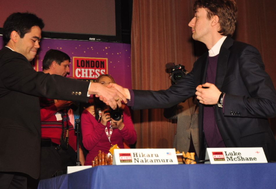Freundliche Begrüßung zwischen Hikaru Nakamura und Luke McShane