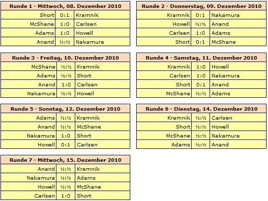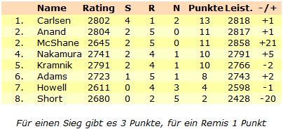 15.12.2010 - Bei der ersten Auflage 2009 hatte Magnus Carlsen die London Chess Classic für sich entschieden und in diesem Jahr konnte er seinen Titel nach turbulentem Turnierverlauf erfolgreich verteidigen. Um auf der sicheren Seite zu sein, musste der Norweger in der Schlussrunde gegen Nigel Short gewinnen, und der Brite machte es ihm wahrlich nicht allzu schwer. In einer eher seltenen Französisch-Variante ging Short sang- und klanglos unter und bescherte seinem Gegner neben dem alleinigen Turniersieg auch noch 50.000,- Euro Siegprämie und die Führung in der nächsten Weltrangliste. Denn parallel machte Viswanathan Anand gegen die Berliner Verteidigung von Vladimir Kramnik keinen Stich, und Luke McShane durfte in seinem neuerlichen Drachen gegen David Howell am Ende froh sein, dass letzterer in Gewinnstellung einer dreimaligen Stellungswiederholung zustimmte, weil er nur noch von dem Zeitbonus lebte und nicht alle Taktiken korrekt durchrechnen konnte. Die letzte Partie der London Chess Classic 2010 war die zwischen Hikaru Nakamura und Michael Adams. Doch nach 63 Zügen endete auch diese unentschieden. Für den Amerikaner ging es immerhin um einen Unterschied von stolzen 15.000,- Euro, wofür sich das kämpfen ja durchaus lohnt. Hätte er gesiegt, wäre er alleiniger Zweiter geworden und hätte 25.000,- Euro kassiert, so bleiben ihm für den vierten Rang "nur" 10.000,-. Nach klassischer Zählweise wären Carlsen, Anand und McShane übrigens punktgleich gewesen, doch darüber werden sich die beiden geteilten Zweitplatzierten sicherlich nicht beklagen, waren die Regeln schließlich vorher allen klar. Letztlich hat der gesiegt, der auch die meisten Partien gewonnen hat, und das kann ja gar nicht so verkehrt sein.