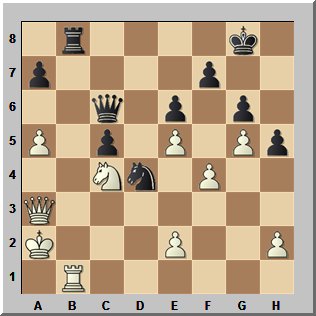 In der Partie folgte noch 31.Dd3 Dc7 32.a6 Dc8 33.Tb3 Dxa6+ 34.Kb2 Dc8 35.Ka1 a6 36.e3 Dc7 37.De4 Td8 -/+ und trotz sehr guter Gewinnchancen, begnügte sich Schwarz hier gegen den 400 Punkte stärkeren Gegner mit einem Remis. ½–½