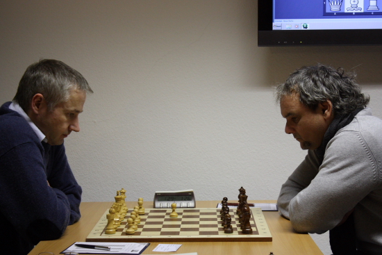 Insgesamt sollte aus allen 50 Begegnungen nur lächerliche 4 unentschieden enden, was bezeugt, dass jeder Einzelne nach Kräften kämpfte. Zwei Partien stachen aus der Auftaktrunde besonders hervor. Da war einmal die Begegnung zwischen Thorsten Ostermeier und FM Tilmann Vogler, die letzterer nach einem sehr zweischneidigen Damenopfer in einem aufregenden Endspiel noch glücklich für sich entscheiden konnte. In der zweiten Partie kann man schwer sagen, wer am Ende der Glücklichere oder Zufriedenere war, denn der Bad Sodener Gerolf Dietz hatte FM Igor Zuyev aus der Eröffnung(!) heraus klar überspielt, ließ aber in völliger Gewinnstellung den Sieg aus. Selbst in der Schlussstellung hatte Dietz zumindest einen Bauern mehr, doch ihm fehlte das letzte Bisschen Schneid, um auf Gewinn zu spielen und so bot er seinem Gegner das Remis an, welches dieser schweren Herzens annehmen musste. Es schien, als hätte sich der erste Titelträger im Kampf um den Turniersieg bereits verabschiedet.