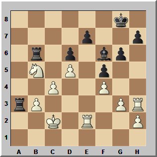 Den eigenen Turm vor den eigenen Bauern so einzumauern, das muss man sich erstmal trauen! Erstaunlicherweise sehen selbst Schachprogramme hier nur einen relativ kleinen Vorteil für Schwarz. Vielleicht völlig zu Unrecht wähnte sich der Nachziehende jedoch in großem Vorteil und vergaß dabei förmlich, dass ihm ein Remis zum Turniersieg gereicht hätte. Doch vergessen wir nicht, Weiß hat einen Bauern mehr! 14...Lxh1 15.Dxh1 De6 16.Lf2 c5 17.Sc3 Sb6 18.a4 cxd4 19.exd4 Tfc8 20.Df3 Tc7 21.Sb5 Tc6 22.a5 Dd5 23.Dxd5+ Sxd5 24.c4 Sf6 25.d5 Se4 26.Ta2 Sxf2+ 27.Txf2 Ta6 28.Ta2 b6 29.Te2 Lf6 30.axb6 Ta1+ 31.Kc2 Txb6 32.Sc3 Ta3 33.Sb5